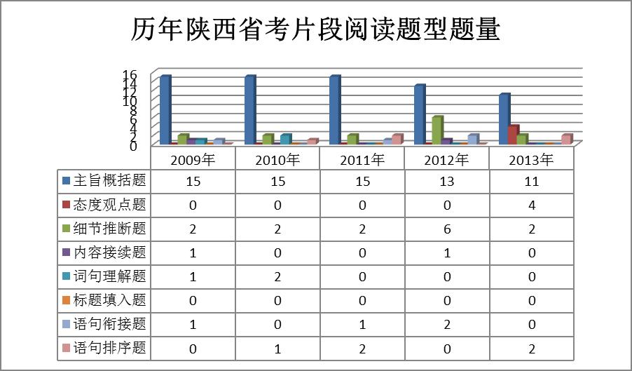 (1)2013年陜西省考片段閱讀題量為19題(還有一題是語病辨析題)。2014年片段閱讀部分題量預(yù)計(jì)為20題,語病辨析題很可能不再考查,但還是希望考生復(fù)習(xí)一下語病辨析題和歧義辨析題,以防萬一;