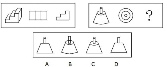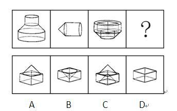 【解析】本題考查的是對一個完整圖形的拆分與重組,但是在拆分或重組時加大了一些難度,就是圖形內(nèi)部可以互相可以鑲嵌,我們從第二個圖形中的錐形為切入點,A、D無法放入錐形,所以排除,C項無法進(jìn)行內(nèi)部的嵌入,因此,本題答案為B
