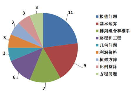 由上圖可以看出:考查的重點(diǎn)集中在極值問(wèn)題(出現(xiàn)了11次)、基本運(yùn)算(不等式、余數(shù)、倍數(shù)等基礎(chǔ)的運(yùn)算知識(shí);出現(xiàn)了9次)、排列組合和概率(出現(xiàn)了7次)、路程和工程(出現(xiàn)了6次);并且考試兼顧考查題型的基礎(chǔ)知識(shí)、解題的實(shí)戰(zhàn)技巧、簡(jiǎn)單的分析推理能力,整體難度逐步加大,題目都需要分析推理才能得到答案。