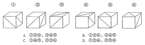 【答案】B。解析:本題考查對角線的方向。觀察六個(gè)圖形,每一個(gè)圖形均為一個(gè)立方體,且有兩個(gè)面中含有對角線,不同的是對角線的方向。如果按照兩個(gè)面橫向排列的角度來看,圖形①③⑥中,對于含有對角線的面來說其對角線的方向均是“從左上至右下”;圖形②④⑤中,其對角線的方向均為“從右上至左下”。即圖形①③⑥是同一個(gè)立方體不同的角度,②④⑤是同一個(gè)立方體不同的角度。故選B。