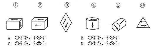 【答案】C。解析:本題考查位置關(guān)系。每一個(gè)圖形均為一個(gè)幾何體中含有兩個(gè)箭頭:單獨(dú)考慮幾何圖形,除③⑥是平面圖形外,其他四個(gè)均是立體圖形,因此按照幾何體的特性并不能將圖形分成兩組,那么本題的研究重點(diǎn)就是“兩個(gè)箭頭”。進(jìn)一步觀察發(fā)現(xiàn),①④⑤中的兩個(gè)箭頭是相互垂直的關(guān)系,②③⑥中兩個(gè)箭頭的位置是相互平行的關(guān)系。故選C。