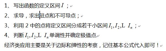 導(dǎo)數(shù)的應(yīng)用主要考察兩方面:幾何應(yīng)用和經(jīng)濟(jì)類應(yīng)用。幾何應(yīng)用主要是考察單調(diào)區(qū)間和極值的求解,一般是解答題中考察,考生要注意步驟規(guī)范,具體步驟如下: