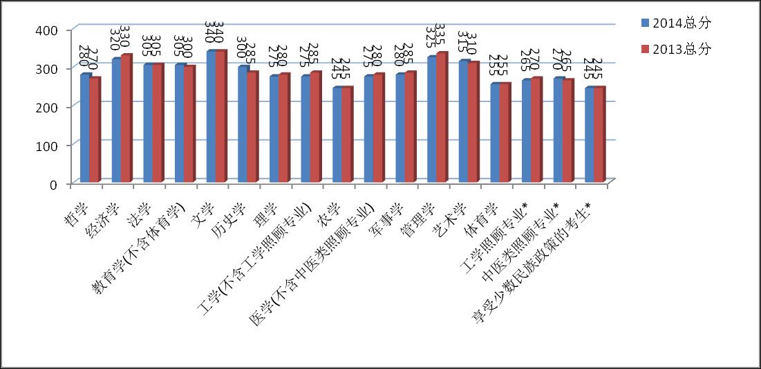 與2013年國家線相比,2014年學(xué)術(shù)型碩士A、B區(qū)國家線在哲學(xué)、教育學(xué)(不含體育學(xué))、歷史學(xué)、藝術(shù)學(xué)、中醫(yī)類照顧專業(yè)等五個(gè)學(xué)科上有所上浮,其中歷史學(xué)分?jǐn)?shù)漲幅高達(dá)15分。經(jīng)濟(jì)學(xué)、管理學(xué)、理學(xué)、工學(xué)(不含工學(xué)照顧專業(yè))、軍事學(xué)、工學(xué)照顧專業(yè)、醫(yī)學(xué)(不含中醫(yī)類照顧專業(yè))等七個(gè)學(xué)科的分?jǐn)?shù)線有5到10分的下降,其中經(jīng)濟(jì)學(xué)與管理學(xué)分?jǐn)?shù)降幅達(dá)到10分。法學(xué)、文學(xué)、農(nóng)學(xué)、體育學(xué)、享受少數(shù)民族政策的考生的分?jǐn)?shù)線保持不變。