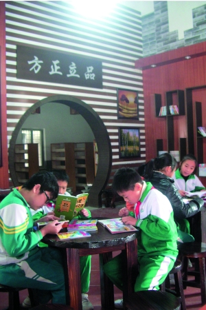 “立品堂”呈左、右對稱兩部,目前前半部分被打造成一個小圖書館,面積約200平方米,包括閱讀區(qū)和藏書室兩部分。木質桌椅、古文牌匾、枝枝綠竹,整個書吧風格古樸淡雅。小書桌、墻上的書架,擺放著《十萬個為什么》、《唐詩三百首》、《論語》、《葫蘆兄弟》等書籍。