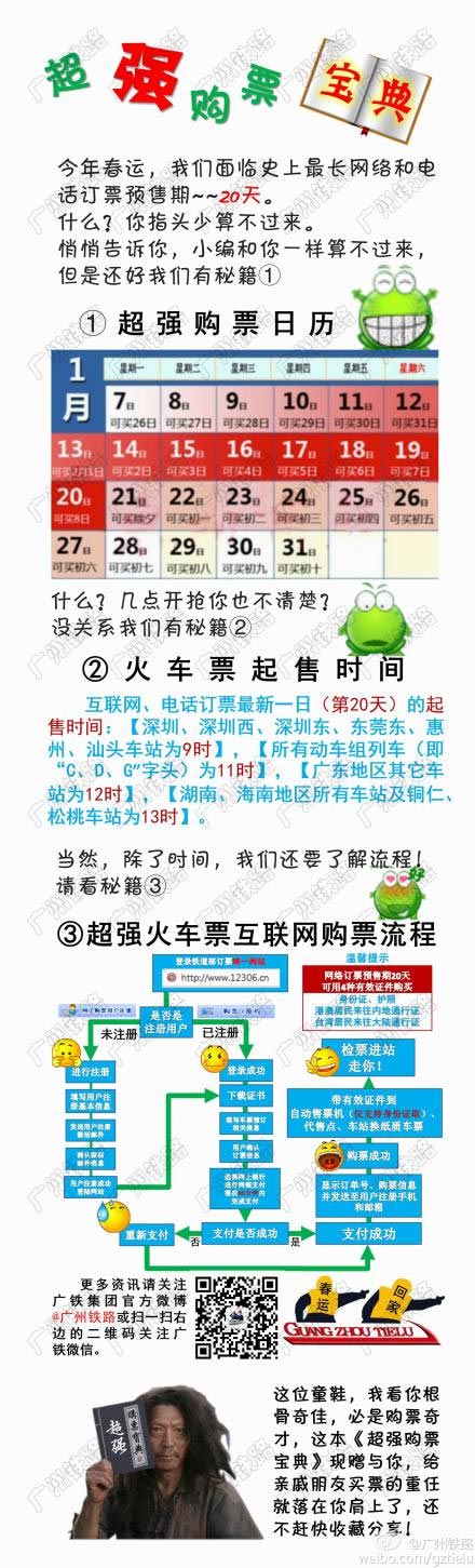 這張“牛圖”稱得上“寶典在手,購(gòu)票不難!币粓D在手便能清晰、直觀地了解到今年春運(yùn)全國(guó)鐵路火車票的預(yù)售日期、廣鐵集團(tuán)各車站起售時(shí)間和互聯(lián)網(wǎng)訂票操作流程。