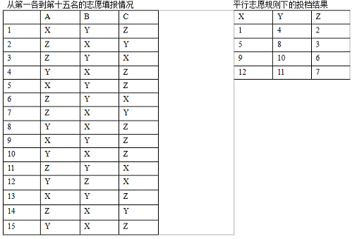 現(xiàn)在,我們參照上表具體解析投檔過(guò)程。假設(shè)共有15名考生(代號(hào)1-15)被劃到第一批次,第一批次共有三所學(xué)校(X、Y、Z)參加錄取,志愿表上學(xué)生只能填報(bào)此三校。并且X、Y、Z三所學(xué)校的招生計(jì)劃都是3人,按調(diào)檔比例算出要投入4人,那么根據(jù)平行志愿的規(guī)則,投檔開(kāi)始后,首先看排在第一名的1考生A志愿報(bào)的哪所學(xué)校,根據(jù)左表,1考生A志愿報(bào)的是X學(xué)校,這時(shí),1考生的檔案就被投送到X學(xué)校;然后再投第二名2考生,2考生A志愿報(bào)的是Z學(xué)校,那么2考生的檔案被投到Z學(xué)校;同樣再看第三名的3考生,第四名的4考生……,依此類(lèi)推。但當(dāng)投送到第11人時(shí),新情況出現(xiàn)了,前10名考生都是投送到A志愿學(xué)校,而第十一名的11考生投檔時(shí),發(fā)現(xiàn)他所報(bào)的A志愿學(xué)校Z檔案已經(jīng)投滿(mǎn),這時(shí)就要看他的B志愿,他的B志愿學(xué)校為Y,這時(shí),從表中發(fā)現(xiàn)Y學(xué)校尚有一個(gè)名額,于是就投送到Y(jié)學(xué)校;然后再看第十二名的12考生,他的A志愿Y學(xué)校、B志愿Z學(xué)校的檔案都已經(jīng)投滿(mǎn),這時(shí)就要看他的C志愿X學(xué)校,招辦發(fā)現(xiàn)X學(xué)校尚有一名名額,于是,就將第十二名的12考生的檔案投送到X學(xué)校。至此,第一輪投檔結(jié)束。13-15號(hào)考生因?yàn)槌煽?jī)低,只有等征集志愿后的第二輪投檔。
