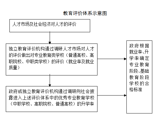 眾所周知,教育的總體目標(biāo)是培養(yǎng)適應(yīng)社會需要的合格人才,因此,能否培養(yǎng)出社會需要的合格人才是評價(jià)教育服務(wù)的基本指標(biāo)。顯然,對教育的評價(jià)是通過對人才的評價(jià)來間接實(shí)現(xiàn)的。那么,在現(xiàn)代市場經(jīng)濟(jì)的社會條件下,對人才的評價(jià)是通過市場來完成的,即各級各類用人單位對各級、各類人才的聘用及考核評價(jià)。只有在用人單位或社會經(jīng)濟(jì)的某一領(lǐng)域創(chuàng)造社會經(jīng)濟(jì)價(jià)值,德才兼?zhèn)涞娜瞬拍芊Q為合格人才。所以,市場是評價(jià)人才最為有效也是最為可靠的工具。于是,對于各類學(xué)校,只要有可能就應(yīng)該通過市場來檢驗(yàn)和評價(jià)。但用人單位對人才的評價(jià)如何轉(zhuǎn)換為對其培養(yǎng)學(xué)校的評價(jià),這還是需要一個(gè)專業(yè)的機(jī)構(gòu)來完成的,目前,在對大學(xué)教育評價(jià)領(lǐng)域,國內(nèi)已經(jīng)有獨(dú)立的研究機(jī)構(gòu)(比如西南財(cái)經(jīng)大學(xué)的麥克思教育調(diào)查公司、中國科學(xué)院武書連先生領(lǐng)導(dǎo)的中國大學(xué)評價(jià)組等)從事這一方面的調(diào)查研究,當(dāng)然政府也可以從事這一調(diào)研及評價(jià)工作,通過這些機(jī)構(gòu)獨(dú)立地調(diào)研及披露,可以讓學(xué)生家長對各大學(xué)的辦學(xué)水平和質(zhì)量有一個(gè)比較直觀的認(rèn)識,從而做到科學(xué)決策,選擇合適的學(xué)校。但他們的工作還有很大的發(fā)展?jié)摿,比如對中等教育中的中職類學(xué)校評價(jià),他們的學(xué)生也是有相當(dāng)一部分畢業(yè)后要直接走向市場的。這里也有一個(gè)評價(jià)轉(zhuǎn)換的問題。
