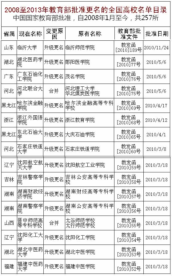 2008至2013年教育部批準更名的全國高校名單目錄【12】