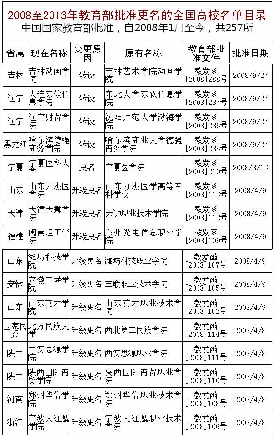 2008至2013年教育部批準更名的全國高校名單目錄【16】