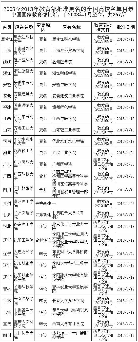 高職?粕(jí)或合并為本科。例如,2013年4月,在創(chuàng)建于1984年的浙江水利水電?茖W(xué)校基礎(chǔ)上建立浙江水利水電學(xué)院;四川旅游學(xué)院由四川烹飪高等?茖W(xué)校與四川省農(nóng)業(yè)干部管理學(xué)院合并組建而成。2011年8月,湖北財(cái)經(jīng)高等?茖W(xué)校并入武漢紡織大學(xué)(原武漢科技學(xué)院)。這些高校更名后都將“逐步過渡到以實(shí)施本科教育為主”。在257所更名高校中,約有三分之一屬于此類。