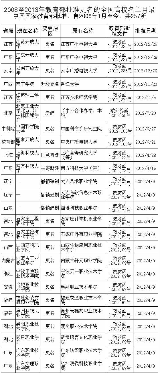 2008至2013年教育部批準(zhǔn)更名的全國高校名單目錄【3】