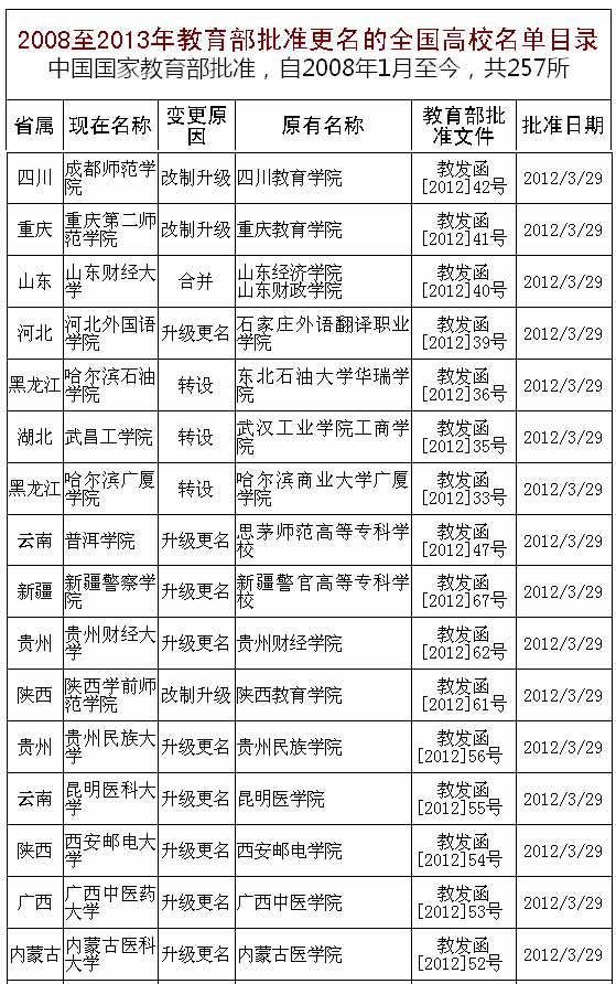 2008至2013年教育部批準(zhǔn)更名的全國高校名單目錄【7】