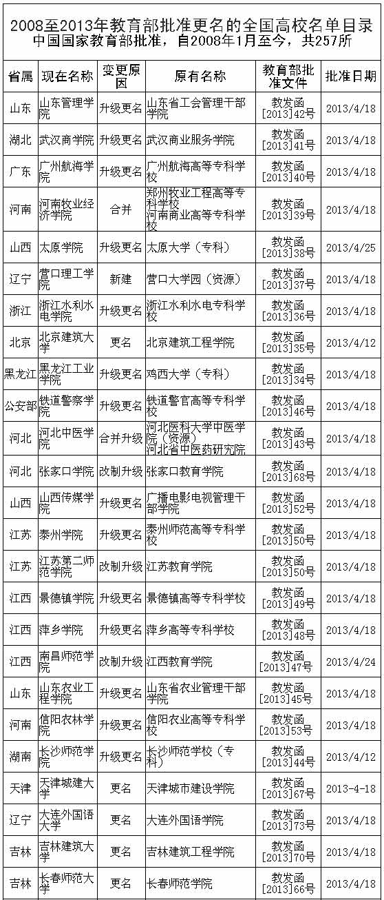 2008至2013年教育部批準(zhǔn)更名的全國高校名單目錄