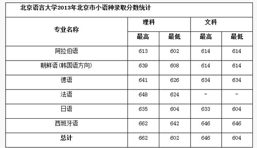 北京語言大學(xué)2013年北京市小語種錄取工作日前圓滿結(jié)束。據(jù)悉,今年該校北京市小語種錄取分專業(yè)按照總分排隊,擇優(yōu)錄取。最終錄取34人,錄取理科最高為662分、最低602分,文科最高646分、最低604分,所有專業(yè)錄取分?jǐn)?shù)均在600分以上。