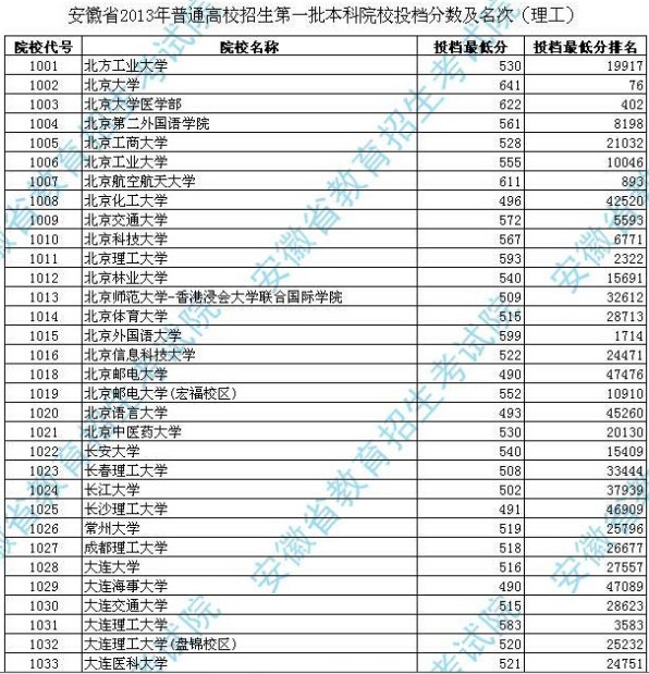 安徽省2013年第一批本科院校投檔分?jǐn)?shù)及名次(理工)