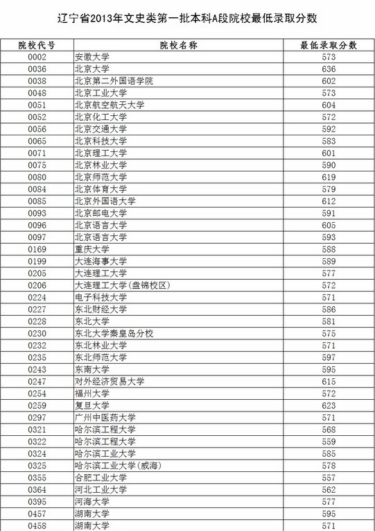 遼寧省2013年一批本科A段最低錄取分?jǐn)?shù)線(文)
