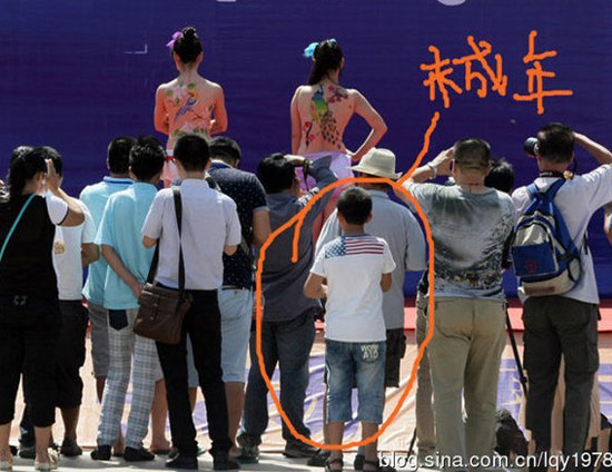 難道是中國人的性觀念不開放?開始踐行性教育從娃娃抓起了嗎?試想下,讓一個幼兒園的孩子看著一群女人穿著內(nèi)衣在臺上大搖大擺;讓她看著一個只穿著薄薄內(nèi)褲的女孩坐在眾人面前被人涂鴉,她那個小腦袋里會怎么想,咦,老師不是說了要講文明嗎,咋這個姐姐不穿衣服就出來了,真是不怕羞?捎挚吹侥敲炊嗳私o她們拍照,那么多閃光燈咔嚓作響,小腦袋肯定混亂起來,你說她們丑、不講文明,可咋那么多人還爭著與她們合影呢。唉,到底是不穿衣服是文明的、還是穿衣服是文明的呢?