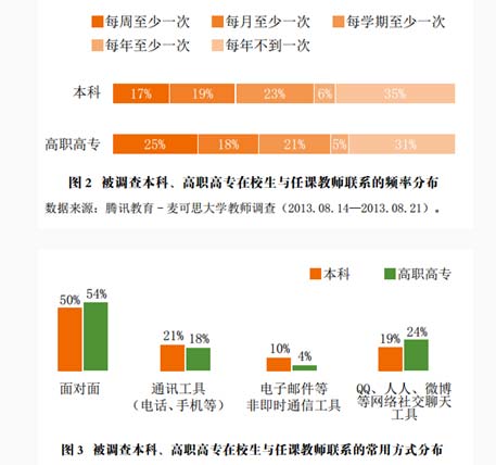 在被調(diào)查的本科生中,36%與任課教師每個月都有聯(lián)系,高職高專生的該比例為43%。同時,35%的本科生和31%的高職高專生與任課教師每年聯(lián)系不到一次。