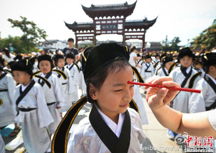 9月1日,南京夫子廟小學(xué)一年級(jí)的新生在夫子廟廣場(chǎng)上舉行“開筆破蒙”典禮,新同學(xué)向孔子像行禮、誦讀《論語(yǔ)》、學(xué)寫“人”字、敲啟蒙鐘、并按傳統(tǒng)習(xí)俗在孩子們的額頭正中點(diǎn)上朱砂,接受“尚禮”傳統(tǒng)文化教育和師長(zhǎng)祝愿,由此正式成為一名學(xué)生。