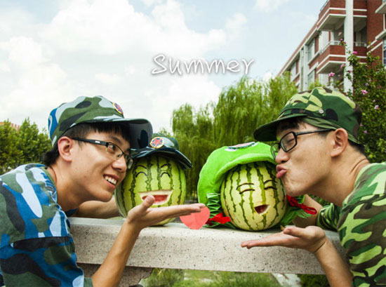軍訓(xùn)天氣炎熱,一只可以讓人清爽的大西瓜是必備品。而西瓜到了愛搞怪的學(xué)生手里,就變成了有思想有情緒的“西瓜君”。尤其是那兩只恩愛的西瓜情侶,好幸福的樣子,讓我們?nèi)ジ惺芤幌掳伞?/span>