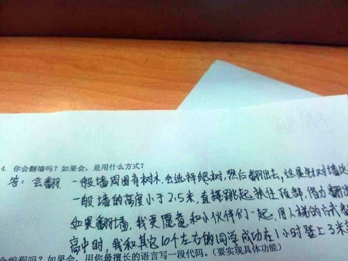 人民網(wǎng)北京9月27日電(歐興榮 實(shí)習(xí)生潘金潔瓊)網(wǎng)上一張名為《筆試題你們來(lái)感受下》的照片近日很火。據(jù)傳,該照片是某網(wǎng)絡(luò)公司招聘的筆試題,題目為:你會(huì)翻墻嗎?如果會(huì),是用什么方式?該題旨在考查應(yīng)聘者通過(guò)何種方式翻越網(wǎng)絡(luò)瀏覽國(guó)外網(wǎng)站,但一位應(yīng)聘者把翻墻理解成爬墻,并聲情并茂的闡述了“如果有樹(shù)會(huì)依托樹(shù)爬出去”甚至還會(huì)“跟小伙伴們用人梯的方式翻出去”,網(wǎng)友看完簡(jiǎn)直笑翻了,更有網(wǎng)友大呼:這么有創(chuàng)意的答案,一定要錄取他。那些年,各種民間高手曾在試卷上為我們奉獻(xiàn)了無(wú)數(shù)笑料,想看看都有哪些嗎?現(xiàn)在就讓小編為你盤(pán)點(diǎn)奇葩的考試答案!