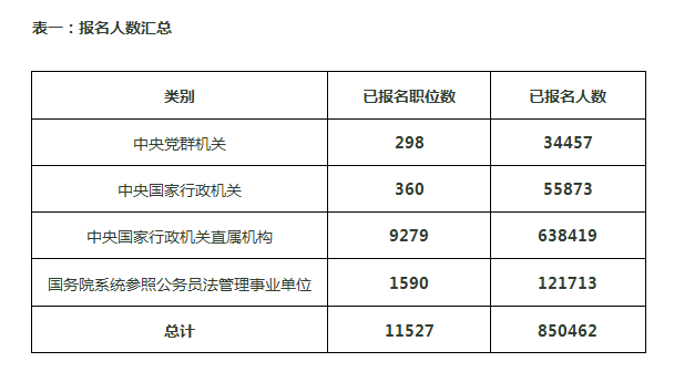 今天是國(guó)家公務(wù)員考試報(bào)名的第八天,也是報(bào)名結(jié)束的倒數(shù)第二日。截至今日10時(shí),共11527個(gè)職位已有考生報(bào)名(占總職位數(shù)的98.3%),報(bào)名人數(shù)總量達(dá)到850462。