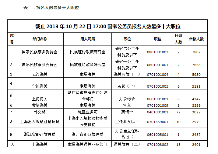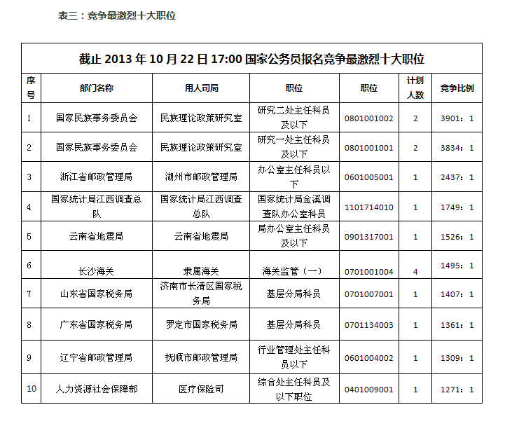 被稱為“炮灰集中營(yíng)”的國(guó)家民委“民族理論政策研究室二處主任科員及以下“職位以3901:1的競(jìng)爭(zhēng)比例保持了競(jìng)爭(zhēng)最激烈職位第一名,國(guó)家民委“民族理論政策研究室一處主任科員及以下”和浙江省郵政管理局“湖州市郵政管理局辦公室主任科員以下”以3834:1、2437:1的微弱差別分列第二名、第三名。