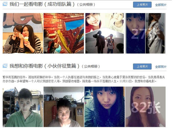 在光棍節(jié)前半個(gè)月,湖南大學(xué)愛電影協(xié)會(huì)組織了“11.11我想和你看電影”活動(dòng)。在活動(dòng)的宣傳詞中寫道:“多希望有一個(gè)人可以穿越茫茫人海,穿越晝夜喧囂,陪我看一場(chǎng)永不落幕的人生!庇^看影片為《我愛的是你愛我》,要求每一個(gè)想要參與活動(dòng)的同學(xué)遞交個(gè)人信息(包括姓名、性別、年齡、院系、參與活動(dòng)想說的話以及1-3張真實(shí)照片)。如果在活動(dòng)相冊(cè)中發(fā)現(xiàn)了想要一起看電影的那個(gè)人,就在他/她的照片下回復(fù),發(fā)出看電影的邀請(qǐng),對(duì)方同意后可以享受優(yōu)惠的觀影價(jià)格?措娪皡f(xié)會(huì)主頁將配對(duì)成功的同學(xué)的照片放到另一個(gè)相冊(cè)里。據(jù)該校同學(xué)介紹,照片累計(jì)點(diǎn)贊數(shù)的前五位會(huì)收到神秘大獎(jiǎng)。目前,這個(gè)活動(dòng)累計(jì)參與人數(shù)已過百,來自各個(gè)院系的帥哥美女們紛紛上傳真相,光棍節(jié)求陪同走起。