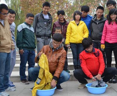2013年11月23日,在山東聊城大學(xué),兩名大學(xué)生扮成孕婦洗衣服,以體驗(yàn)做母親十月懷胎的艱辛。