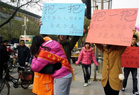 感恩節(jié)前,山東大學(xué)生志愿者與一位清潔工人互相擁抱傳遞溫暖、愛心與感恩。