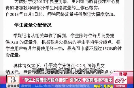根據(jù)中國(guó)時(shí)刻報(bào)道,2013年十月底,東莞理工學(xué)院學(xué)生媒體中心官微“@莞工學(xué)生媒體中心”發(fā)布微博,表示自2013年12月1日起,“師生網(wǎng)絡(luò)流量將得到較大幅度增加”。據(jù)了解,具體辦法是:學(xué)院教務(wù)部門會(huì)把學(xué)生每年的平均學(xué)分績(jī)點(diǎn)匯總,統(tǒng)一交給學(xué)院的網(wǎng)絡(luò)與教育技術(shù)中心,該中心會(huì)按績(jī)點(diǎn)設(shè)定學(xué)生可獲得的對(duì)應(yīng)流量。按照規(guī)定,每位學(xué)生每月可獲得免費(fèi)的1GB流量,付費(fèi)流量分三個(gè)等級(jí),平均學(xué)分績(jī)點(diǎn)﹤2.5,每月可申請(qǐng)不超過(guò)5GB流量,平均學(xué)分績(jī)點(diǎn)≥2.5且﹤3.0,每月可申請(qǐng)不超過(guò)10GB流量,平均學(xué)分績(jī)點(diǎn)≥3.0,每月可申請(qǐng)不超過(guò)15GB流量。