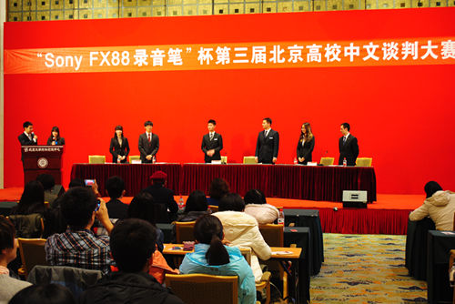 人民網(wǎng)北京12月10日電 周日晚,由索尼(中國)有限公司獨(dú)家贊助的“Sony FX88錄音筆杯”第三屆北京高校中文談判大賽在北京大學(xué)英杰交流中心陽光大廳成功舉辦。參加決賽三方談判的三支隊(duì)伍來自北京外國語大學(xué)、外交學(xué)院和中國政法大學(xué)。經(jīng)過一個(gè)小時(shí)的精彩談判,北京外國語大學(xué)代表隊(duì)獲得了本屆大賽的冠軍。