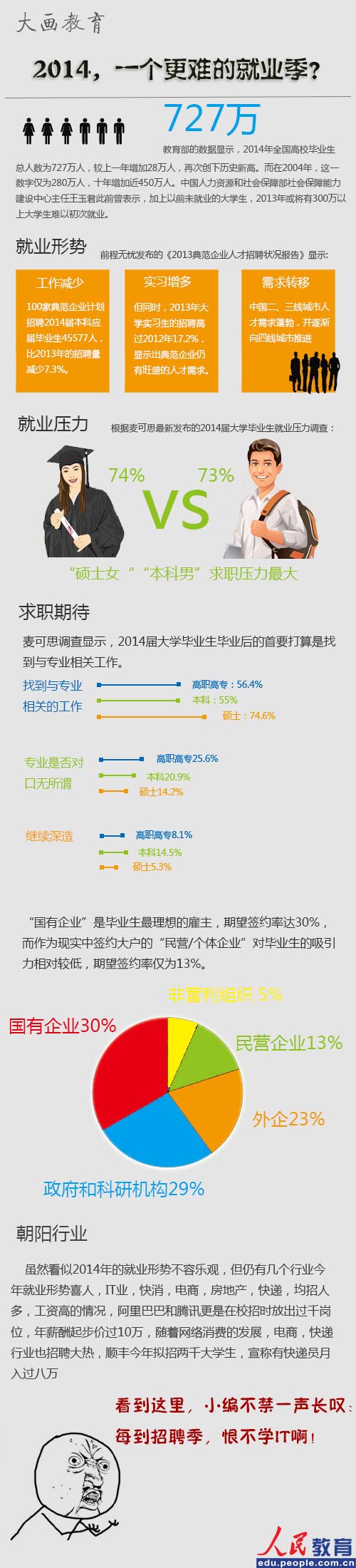 人民網(wǎng)北京12月13日(熊旭 實(shí)習(xí)生潘金潔瓊)2014年,727萬(wàn)大學(xué)畢業(yè)生涌入就業(yè)市場(chǎng),加上以前沒(méi)有就業(yè)的大學(xué)生,預(yù)計(jì)將有300萬(wàn)大學(xué)生無(wú)法初次就業(yè),但同時(shí),物流,IT,電商等行業(yè)的飛速發(fā)展有為大學(xué)生們提供了更多高薪崗位,那么2014年是一個(gè)更難就業(yè)季嗎?為此人民網(wǎng)教育頻道推出“大畫教育”,小編為您圖解2014大學(xué)生就業(yè)形勢(shì),如果喜歡,請(qǐng)?jiān)谛睦锬c(diǎn)贊!