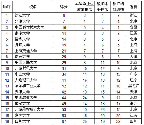 中國一流大學順序按得分排列,得分越低排名越高。得分相同,按教師水平排序。各大學得分等于上表畢業(yè)生質(zhì)量排名、教師水平排名、教師績效排名之和。其中,武漢大學、四川大學首次進入中國一流大學。