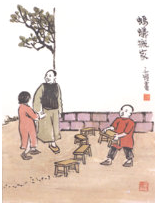 一個(gè)小販用竹筐挑著兩個(gè)瓦缸,悠然走在山間小路上。腳下一踉蹌,竹筐落地,靠山崖一邊的瓦缸從竹筐里滾出來(lái)。一直滾下了長(zhǎng)滿雜草灌木的山崖。小販看著還留在身邊的另一個(gè)瓦缸,心頭火起。拾起路邊的石頭將瓦缸砸得粉碎。