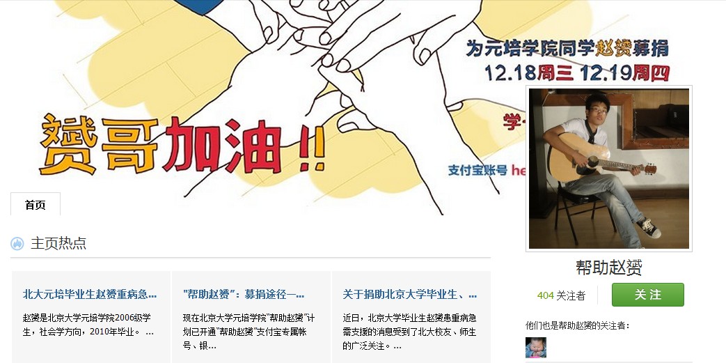 同時(shí),北京大學(xué)元培學(xué)院也在人人網(wǎng)上建立了“幫助趙赟”公共主頁,上傳了趙赟的事跡報(bào)道、捐款渠道、在校照片等信息;向校新聞網(wǎng)上推送了“元培學(xué)院等單位向師生校友發(fā)倡議 捐助北大校友、支教志愿者趙赟”的新聞報(bào)道。讓在校師生更加立體地了解了趙赟校友,很多在校師生通過這些新聞報(bào)道,了解趙赟,關(guān)注趙赟,也為他的救治獻(xiàn)上了一份微薄之力。