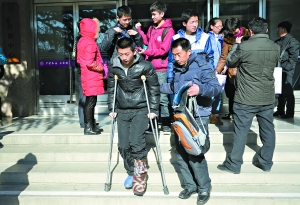 昨天,清華大學(xué)“自強計劃”測試的筆試結(jié)束,一名考生前幾天摔傷了腳,拄著雙拐在家長的攙扶下走出考場。(本報記者 和冠欣攝)