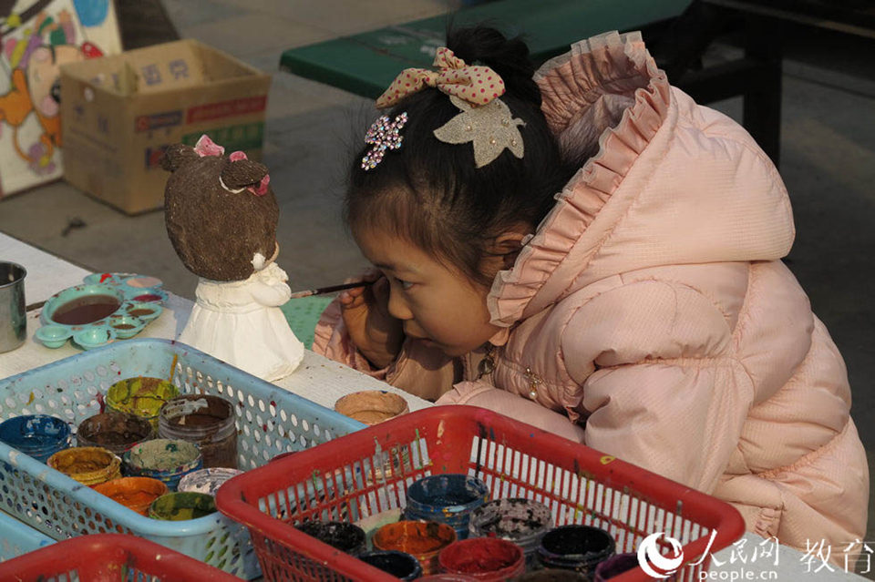 廣場(chǎng)上,放了寒假的小朋友在認(rèn)真的給陶瓷娃娃上顏色。