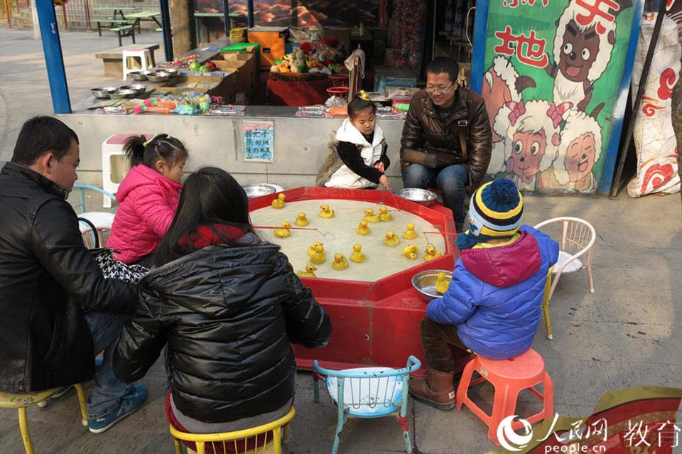 放寒假了,大人們帶著小孩兒在廣場(chǎng)上一起玩。