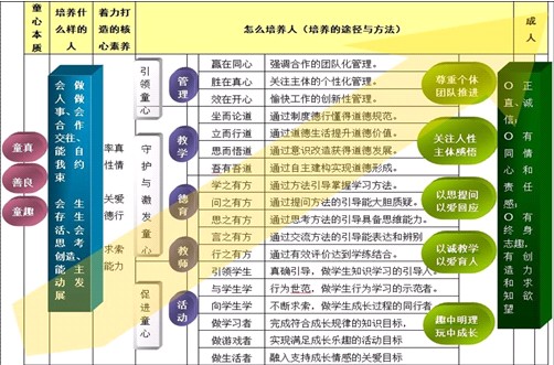 學(xué)校從管理、教學(xué)、德育、教師、學(xué)生幾個(gè)方面;從引領(lǐng)童心、守護(hù)童心到促進(jìn)童心幾個(gè)角度;從培養(yǎng)什么樣的人到怎么培養(yǎng)人這一教育問題的提出與回答,形成了童心教育整體性發(fā)展的理念框架。架——童心的本質(zhì)即童真、善良、童趣;童心教育就是要培養(yǎng)會做人做事、會合作交往、能自我約束、會生存生活、會思考創(chuàng)造、能主動發(fā)展的人;童心教育著力打造的核心素養(yǎng)為率真心情、關(guān)愛德行、求索能力;通過童心管理引領(lǐng)童心,通過童心教學(xué)、童心德育、童心教師的塑造守護(hù)激發(fā)童心,通過童心學(xué)生的培養(yǎng)促進(jìn)童心;最終培養(yǎng)出正直誠信、有同情心和責(zé)任感、有終身志趣、有創(chuàng)造力和求知欲望的人。