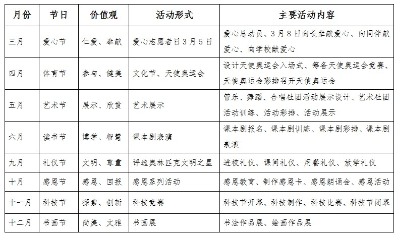 學(xué)校創(chuàng)建了《奧林匹克文化教育活動(dòng)體系》,為培養(yǎng)國際素養(yǎng)的小公民搭建成長的舞臺(tái),特色鮮明的活動(dòng)貫穿全年。