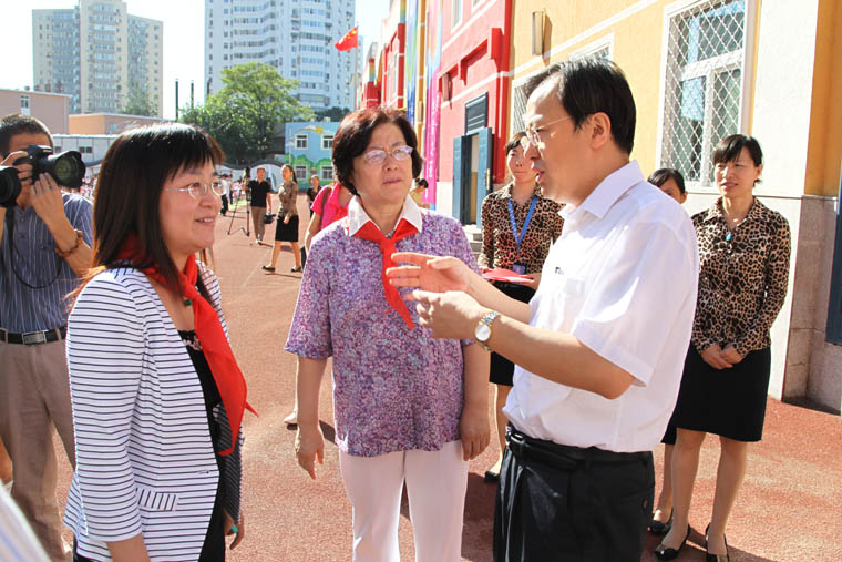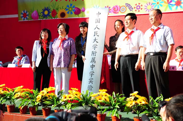 2013年8月31日,海淀區(qū)政府孫文楷區(qū)長(zhǎng)(右一)出席人大附中實(shí)驗(yàn)小學(xué)開(kāi)學(xué)典禮暨更名儀式并就學(xué)校工作進(jìn)行指導(dǎo)