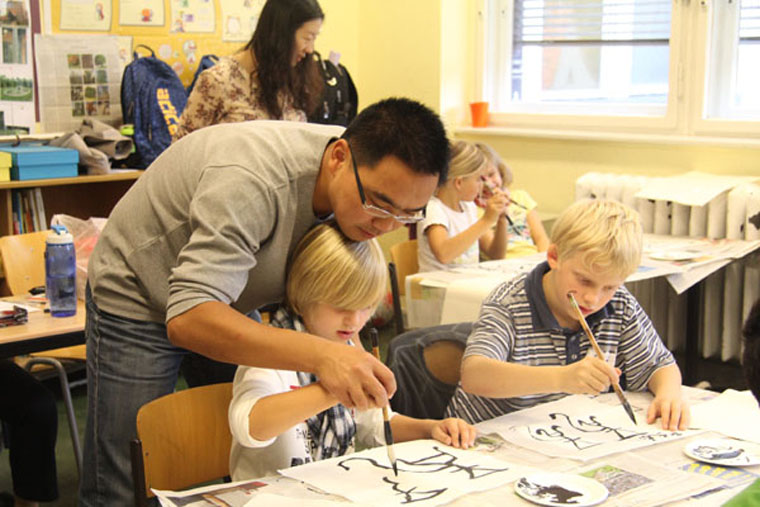 2011年9月,人大附中實(shí)驗(yàn)小學(xué)實(shí)驗(yàn)楊華老師為德國(guó)柏林維克多爾·格朗次小學(xué)同學(xué)上軟筆書法課。