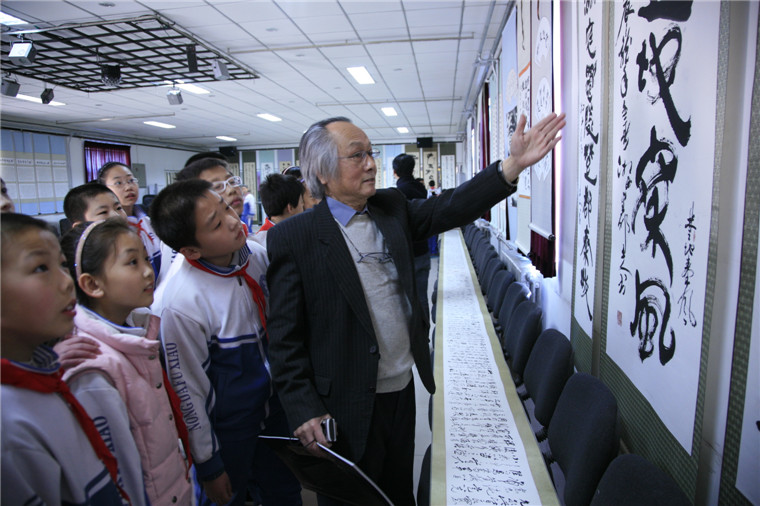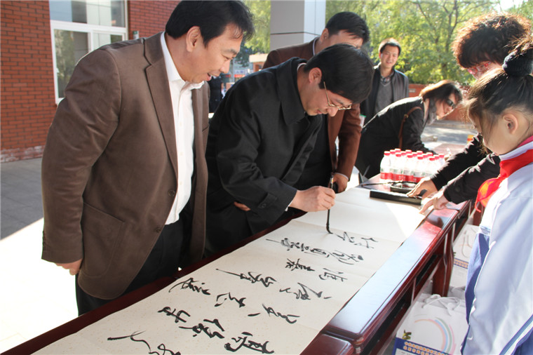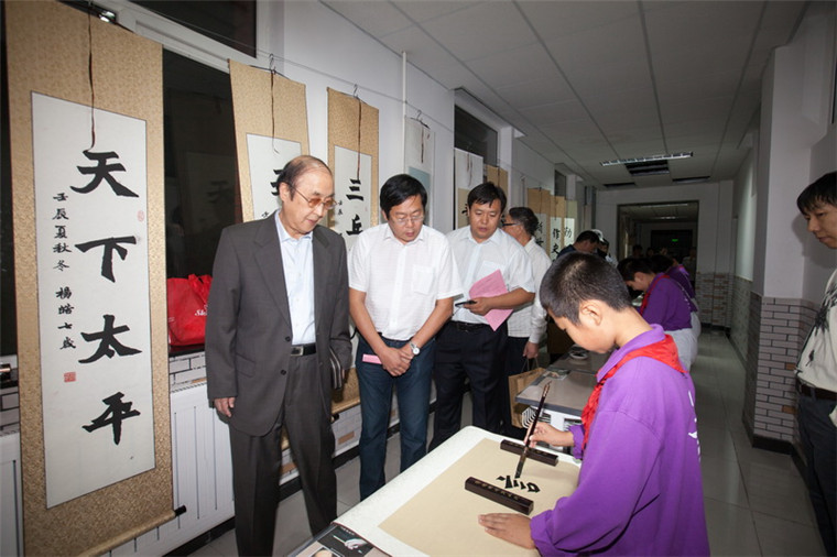 在農(nóng)大附小校長趙建軍的陪同下 來賓觀看同學們書法表演