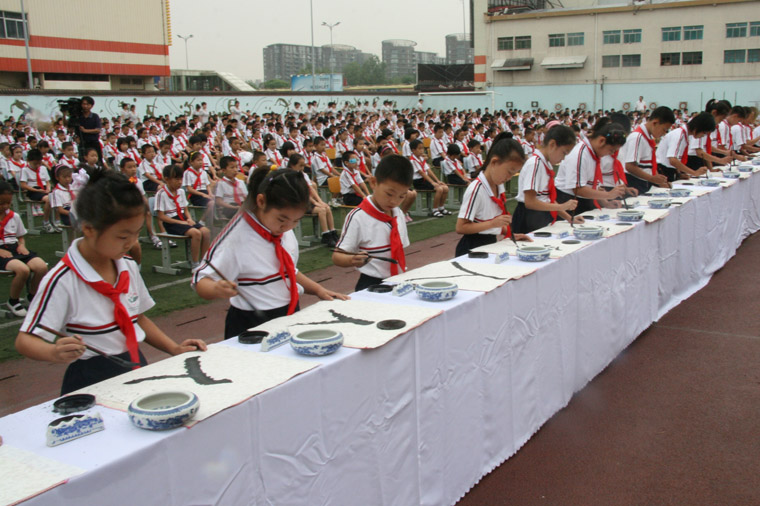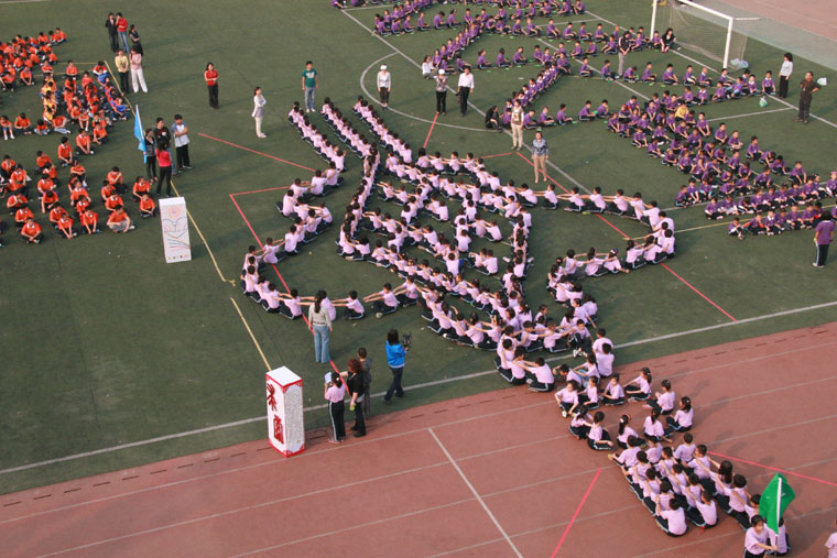 2011年9月26日,首師附小舉辦第一屆挑戰(zhàn)十小時活動。此圖為:百人多米諾組成的求索中國結(jié)