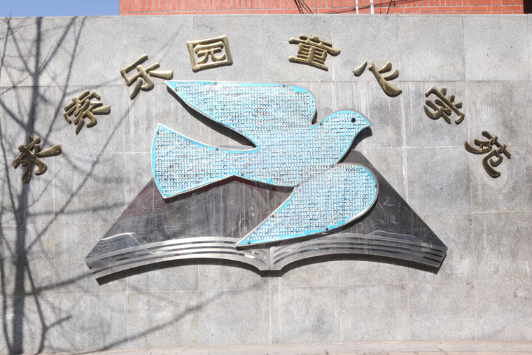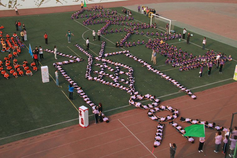 2011年9月26日,首師附小舉辦第一屆挑戰(zhàn)十小時活動。此圖為:童心德育的群體活動展示-百人多米諾組成的求索中國結(jié)