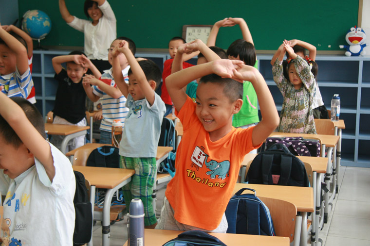 每一年新入學的一年級新生要參加入學培訓。此圖為:首師附小的一年級新生在課堂上進行愉快的活動