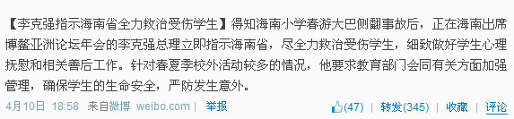 人民網(wǎng)北京4月11日電 (記者林露)昨天下午,國務(wù)院辦公廳政府信息公開辦公室在微博上發(fā)布消息:“得知海南小學(xué)春游大巴側(cè)翻事故后,正在海南出席博鰲亞洲論壇年會(huì)的李克強(qiáng)總理立即指示海南省,盡全力救治受傷學(xué)生,細(xì)致做好學(xué)生心理撫慰和相關(guān)善后工作。針對(duì)春夏季校外活動(dòng)較多的情況,他要求教育部門會(huì)同有關(guān)方面加強(qiáng)管理,確保學(xué)生的生命安全,嚴(yán)防發(fā)生意外!