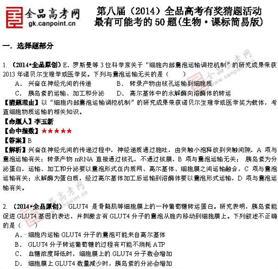 2014高考最有可能考的50道生物題