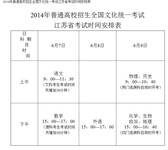 2014年普通高校招生全國文化統(tǒng)一考試江蘇省考試時間安排表